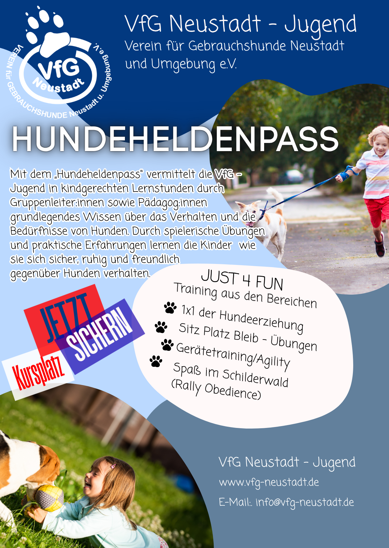 Mit dem Angebot „Hundeheldenpass“ vermittelt der VfG Jugend in kindgerechten Lernstunden durch Gruppenleiter/innen sowie Pädagogen/innen grundlegendes Wissen über das Verhalten und die Bedürfnisse von Hunden. Durch spielerische Übungen und praktische Erfahrungen lernen die Kinder wie sie sich sicher, ruhig und freundlich gegenüber Hunden verhalten.